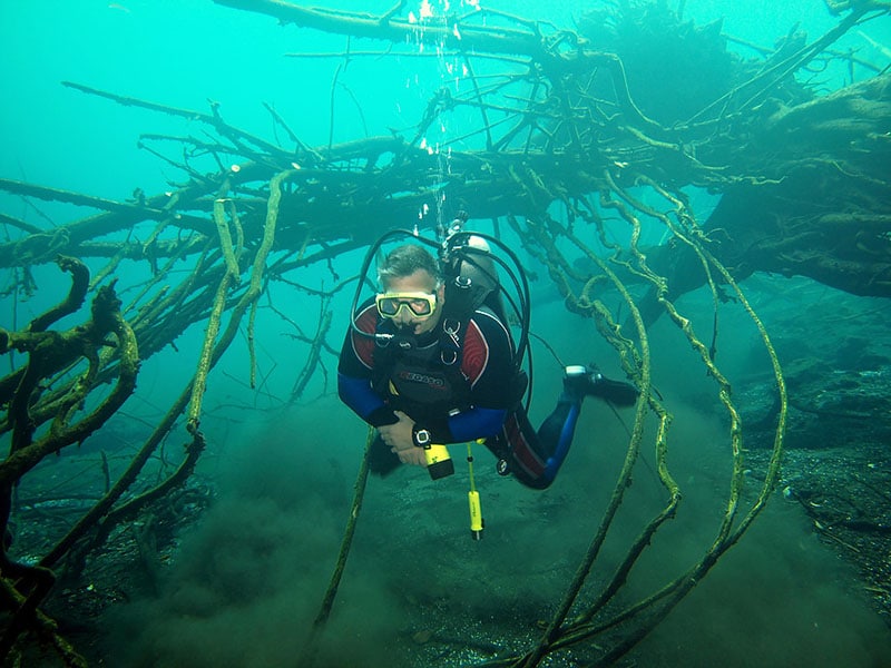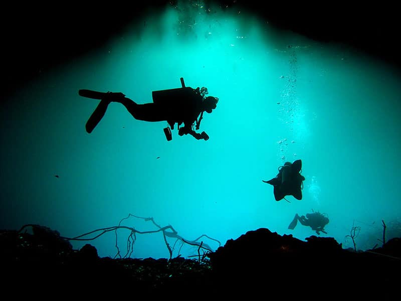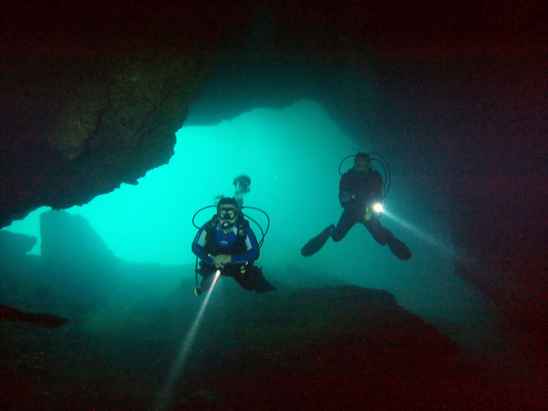 This full day excursion is one of the highlights in the are and an absolute must-do for the experienced divers. It’s a 75 minutes drive along the Dominican Northcoast to reach Dudu Blue Lagoon. We cross Cabarete, Gaspar Hernandez and Rio San Juan before we can see the crystal clear water of lake Dudu. After the briefing and equipment donning we talke that giant stride and hit the water. We go down 6-8m/20-25ft where we find the first tunnel. What sounds a little scary looks quite familiar in the light of a diver’s lamp. The tunnel which brings us to a lake in the middle of the jungle is 90m/98yd long and 6-8m/20-26ft wide. It is packed with stalactites a fossils. The light and the up to 3m/10ft long stalactites are breathtaking.